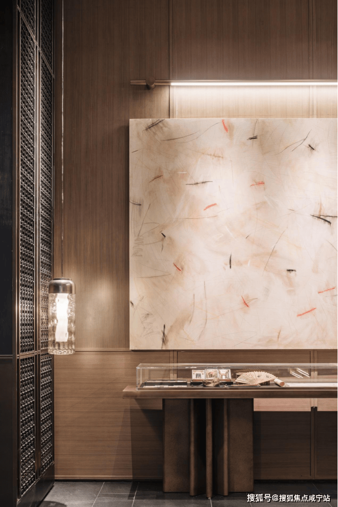——在公区入户大堂内,造型别致的壁灯格外惹眼,其灵感来自于“中国古典豆形灯”;落壁灯则是以古铜不锈钢搭配仿透光云石灯具,营造出朦胧的光晕氛围,颇具东方意蕴。